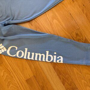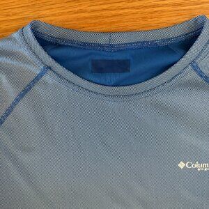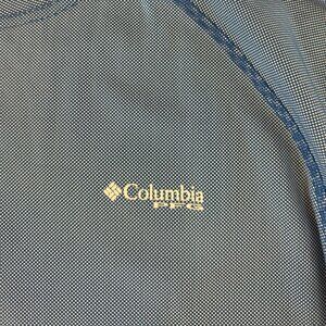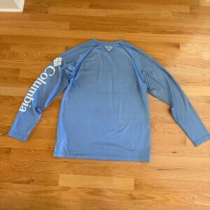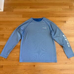 Columbia Men’s PFG Terminal Tackle™ Long Sleeve Shirt. IDEAL FISHING LAYER. Blue with small white dots. Columbia and PFG in large letters on the left sleeve. Also on the left chest area in smaller print.