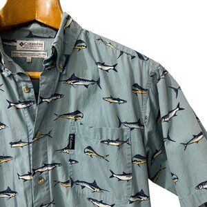 Columbia Men's Short Sleeve Button-Up Shirt With Fish Print Light Blue XL