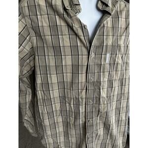 Columbia plaid shirt. tan cotton shirt. Columbia men's sportswear. men's plaid button-down. long sleeve casual shirt. medium plaid shirt.