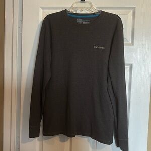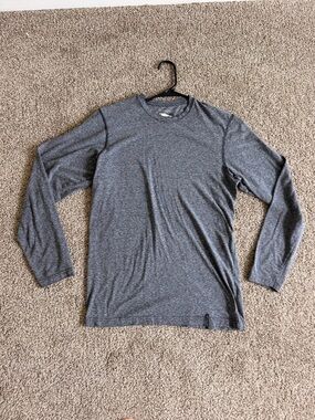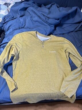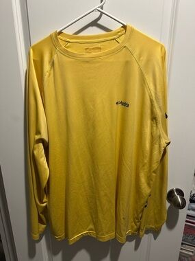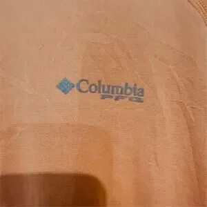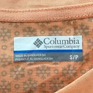 The Columbia Men's T-Shirt in size S is a long sleeve, solid orange shirt made from recycled polyester and polyester. It is lightweight, breathable, and machine washable. Manufactured in Bangladesh, this regular size t-shirt is pre-owned. Keywords: Columbia, men's t-shirt, long sleeve, orange, size S, lightweight, breathable, recycled polyester, machine washable, solid color.