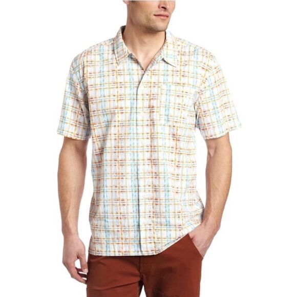 Men’s Trollers Beat Short Sleeve Shirt from Columbia. Mirage/Tortuga plaid print. 100% cotton. Button down front. PFG logo on back. Venting in back for comfort. Size L. Approximate flat lay measurements- Chest: 24” across from armpit to armpit. Length: 30”. Gently preowned condition with no tears, stains, picks or pilling.
