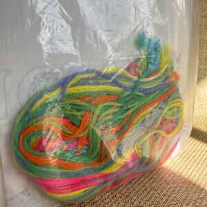 This 1970s embroidery kit includes printed fabric, yarn, needle, and instructions to create a colorful 18" x 14" alphabet sampler. Each letter features whimsical motifs, making it a fun and easy project for beginners or experienced stitchers alike.
