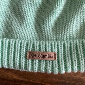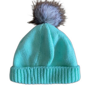 Mint green knit exterior, gray fuzzy faux fur ball, brand tag, fleece interior.