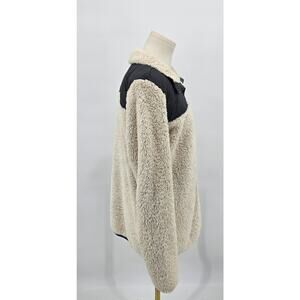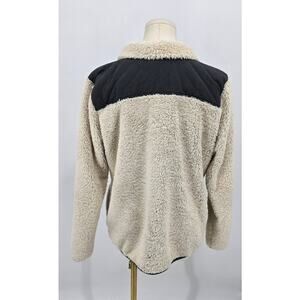 Stay cozy and stylish in this Columbia Mountainside Sherpa Fleece Jacket. Features ultra-soft cream sherpa material with a contrasting charcoal quilted yoke. Full zip front, zip chest pocket, and Columbia logo patch for that signature outdoor style. Perfect for layering on chilly spring mornings or crisp fall hikes. Excellent condition!