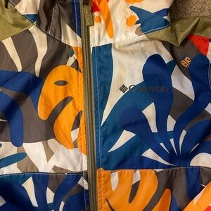 Stylish jacket with a vibrant leaf pattern. Features blue, orange, and green hues. Includes a hood for added comfort.