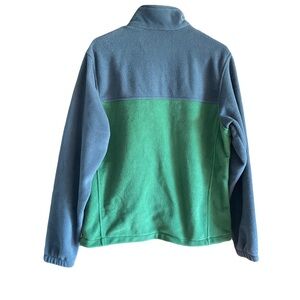 Stylish Columbia fleece jacket in blue and green. Perfect for outdoor adventures.