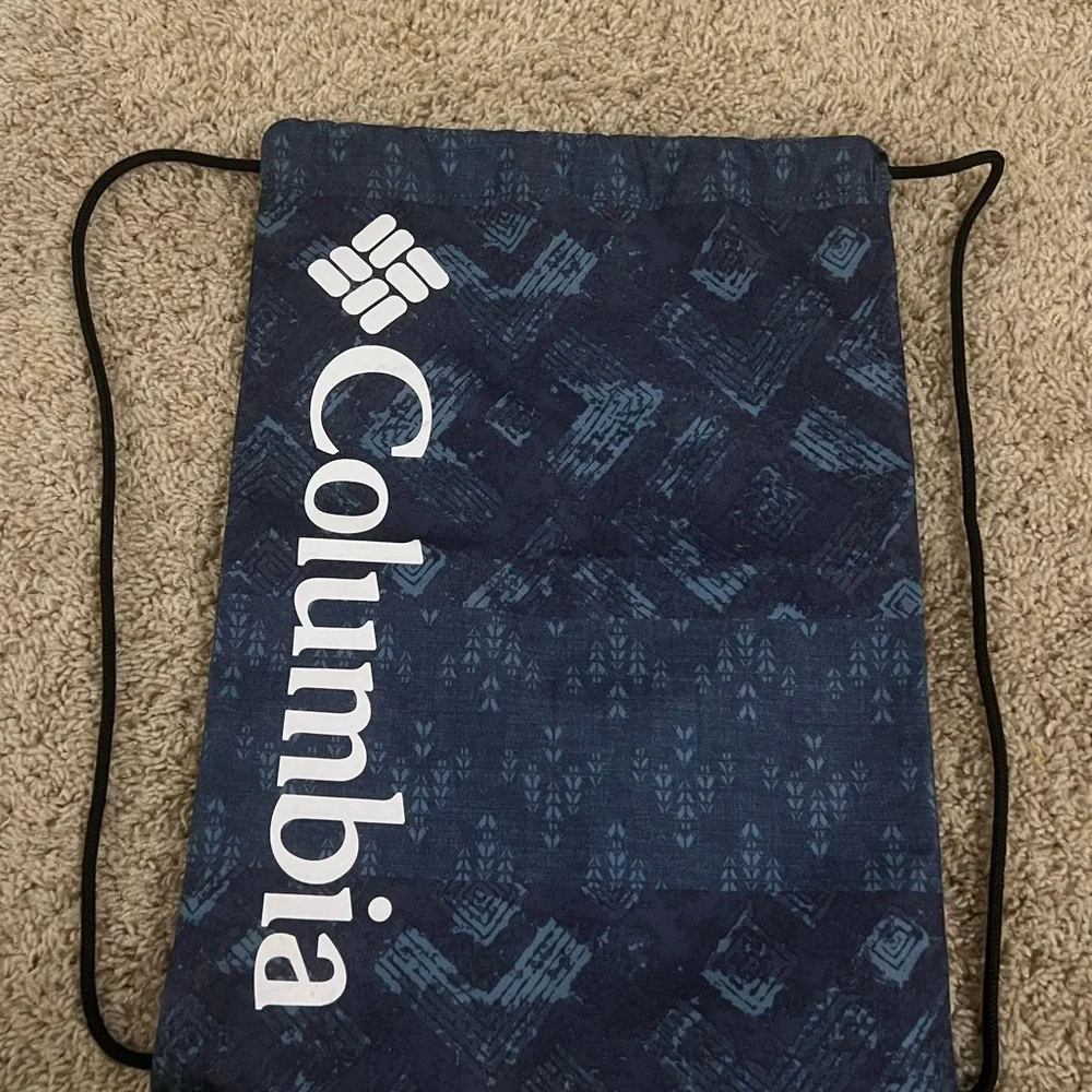 Navy drawstring backpack with geometric patterns. Features Columbia logo. Ideal for daily use.