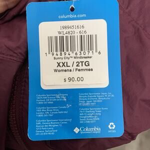 The Columbia Women's XXL Windbreaker Jacket in Maroon Plum is a stylish and practical choice for outdoor activities in the summer, fall, or spring. Made from 100% nylon with a lightweight nylon fabric, this mid-length jacket features a two-way zipper for easy wear. The jacket is packable and easy to care for with a machine washable lining made of 100% polyester. With a regular fit and long sleeves, this Columbia windbreaker is perfect for walking, cycling, hiking, and other outdoor activities. Its solid color and activewear style make it a versatile addition to any wardrobe for women who enjoy staying active and outdoor. MSRP $90.00.