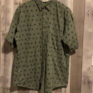 Short sleeve button down shirt. Missing one button. Extra buttons included and can easily be sewn on. Excellent Preowned condition.