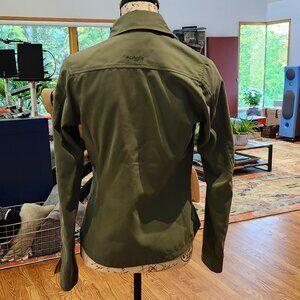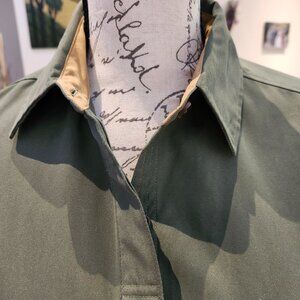 This Columbia fitted shirt/jacket features a smooth Olive green fabric, pointed collar, long sleeves, zippered cuffs, two hidden zippered pockets in front at the seam, and a concealed button-down design.