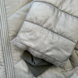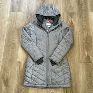 Columbia Omni Heat Puffer Jacket Womens Small Long Gray Hooded Coat Parka FLAWS