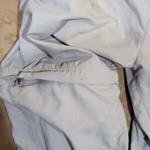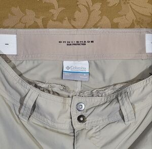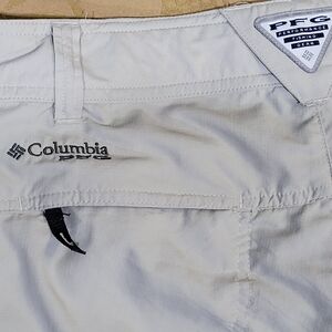 Columbia PFG (Pro Fishing Gear) khaki omni-shade sun protection ripstop pants that zip off to shorts. Excellent used condition. Inseam measures about 10" to the shorts, 31.5" to the pant hem. Waist measures about 15" flat across and has adjustable elastic to tighten as needed.