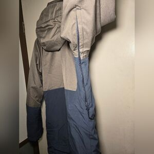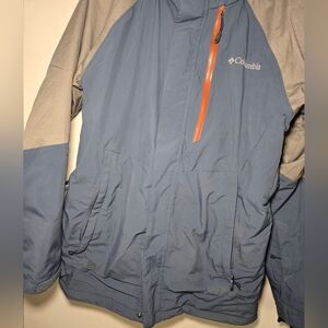 This Columbia Omni-Heat jacket is a waterproof, insulated men's jacket in size Small. It features a softshell fabric with a stand-up collar, detachable hood, and zip closure. The jacket is designed for outdoor activities in winter, fall, and spring, with Omni-Heat warmth technology. It comes in a blue and gray color with accent details like zippers, pockets, and the Columbia logo, making it suitable for travel, casual wear, outdoor activities, and workwear. There is a inside pocket as well. Some discoloration seen at the neck, seen in picture.