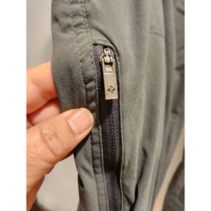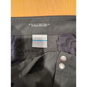 Columbia Sportswear women's capri pants in dark gray, size 16W. Made with Omni-Shield advanced repellency fabric to resist water and stains. Lightweight and stretchy nylon blend (96% nylon, 4% elastane) with a partial elastic waist and zippered pockets. Features 14" inseam, 19" flat waist, 12" rise, and 7" leg opening with drawcord hems. Ideal for hiking, travel, or casual wear in warm weather. Pre-owned and in very good condition with no holes or stains. Durable and comfortable fit for active outdoor days.