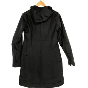 The Columbia Titanium Omni-Shield long black jacket is a durable, hooded design with a full zip, perfect for hiking or outdoor activities.