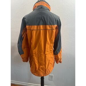 Columbia Women’s Omni-Tech Interchange waterproof jacket in orange and gray. Size XL. This is a 3-in-1 compatible shell designed for wet, cold, and variable weather. Heavy-duty construction with tons of pockets and vents.