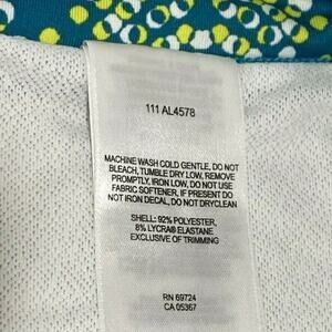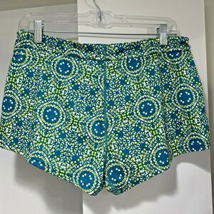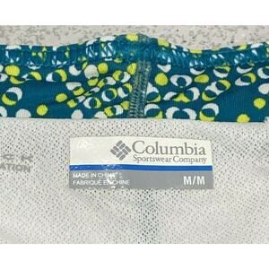 Columbia Omni-Wick shorts - ladies size M - green yellow & white abstract all-over print - polyester lycra elastane blend fabric has some stretch with soft drape - drawstring waist - inner liner - one zip pocket at the waist. Excellent pre-owned condition - light wear - no damage or flaws.