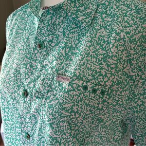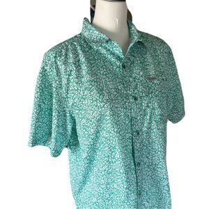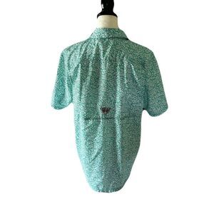 Stay cool and protected on or off the water in this Columbia Performance Fishing Gear (PFG) shirt. Lightweight and breathable with short sleeves and button-front closure, it’s perfect for fishing, hiking, or casual wear. Features an allover green and white abstract print, vented back for airflow, and Columbia logo on the chest.
