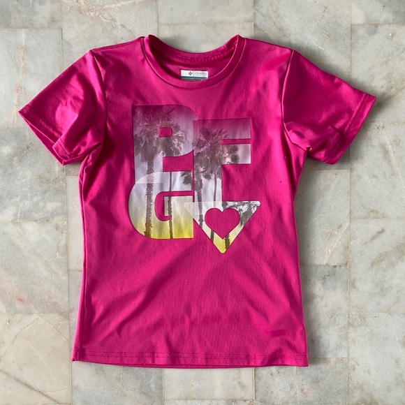 Columbia Moisture Wicking Graphic Tee in Hot Pink. Size Medium (Fits 10/12 Girl Comfortably). Minor Pilling on front (see photo). No holes, tears or stains. Non smoking home. Bundle to save more!