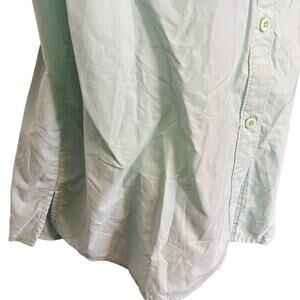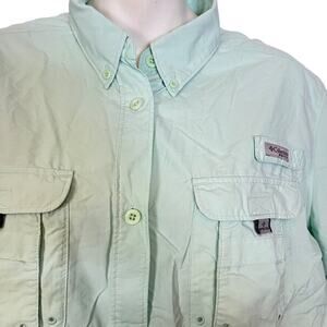 This Columbia PFG Fishing shirt in aqua green is a women's size XL with a collared, button-down neckline and short sleeves. Made of a lightweight blended fabric with breathable properties, this casual shirt features a button-down collar style and a chest size of 46 inches. Designed for fishing activities, it includes Omni-Shade technology for sun protection and vented panels for added comfort during summer, fall, and spring seasons. Complete with pockets, this Columbia shirt is machine washable and ideal for outdoor adventures.