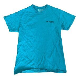 Columbia PFG Sportswear Company Graphic Print T-Shirt in Teal Green. It is a Crewneck Short Sleeve T-Shirt featuring a great screen print graphic design on the back of a classic Columbia Performance Fishing Gear large logo, there is also a Logo Hit on the front left chest. Look cool on shore or your boat Fishing or anywhere.