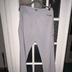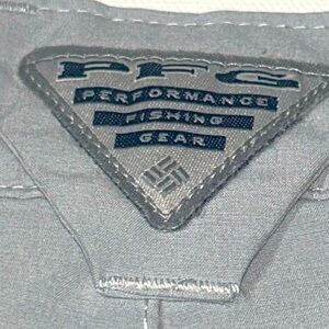 The Columbia Performance Fishing Gear Outdoor Light Gray Chino Cargo Pants. Made from polyester material, these pants feature a windbreaker style, zip up side pockets, and are part of the Columbia PFG product line. Size 34