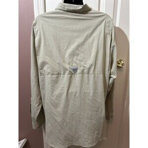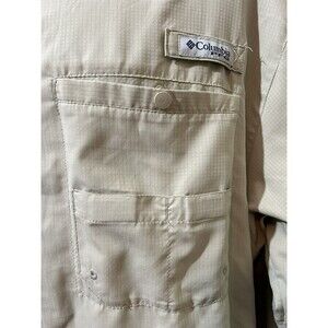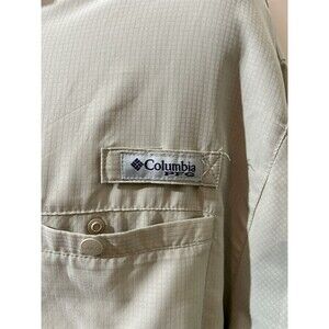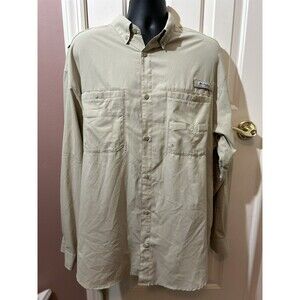 Introducing the Columbia PFG Omni-Shade Long Sleeve Shirt for Men in size XL. This khaki-colored shirt is perfect for fishing enthusiasts who want to stay lightweight and breathable while on the water. Made of 100% polyester fabric, this regular-fit shirt comes with a vented design and Omni-Shade technology to keep you cool and comfortable.