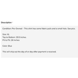 Condition: Pre-Owned - This shirt has some fabric pulls and a small hole. See pics.