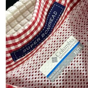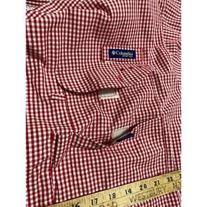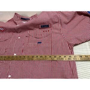 Columbia PFG Super Bonehead short sleeve button-up shirt in red/white gingham check with embroidered Arkansas Razorbacks logo. Vented back yoke, utility loop, and lightweight cotton build for fishing or outdoor wear. Tagged XL, flat lay measurements shown. Pre-owned, excellent condition with no major flaws. Great for college drops, outdoor bundles, or Columbia resale.