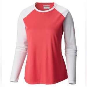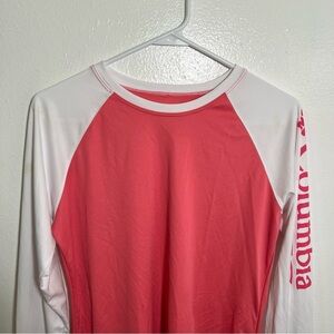 Good condition, has a couple of small spots on sleeve as shown. Columbia. Tidal II Long-Sleeve T-Shirt. Pink and white colorblock. Omni-shade sun protection. Size Medium. 100% polyester. Pit to pit laying flat 19” shoulder to hem 25” sleeve (shoulder to hem) 27”. All measurements are approximate and taken lying flat. Smoke free home. No trades, offers welcome.