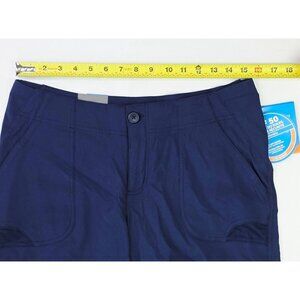The Columbia PFG Women's Shorts in size 10 are designed for outdoor activities with features such as UPF 50 repellency, making them ideal for hiking, walking, or fishing. The navy blue color and logo accents add a stylish touch to these chino-style shorts with a mid-rise fit and 8-inch inseam. With a zip closure and slash pockets, these shorts are perfect for various occasions including casual outings, workwear, or formal events during all seasons. Made of nylon and spandex, these machine washable shorts are a versatile addition to any woman's wardrobe, combining functionality with a trendy design.