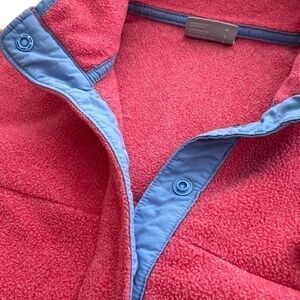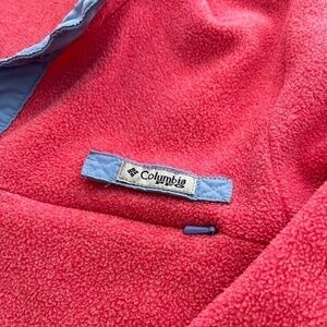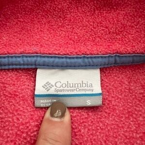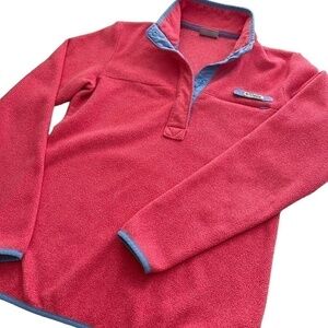 Columbia PFG Women's Half Snap Fleece Pink Pullover. Size Small. Baby blue trim. Half snap front closure. Left chest zipper pocket. Pit to pit measurement approximately 19" as pictured. Soft fleece fabric. 100% polyester. Machine washable. Good condition.