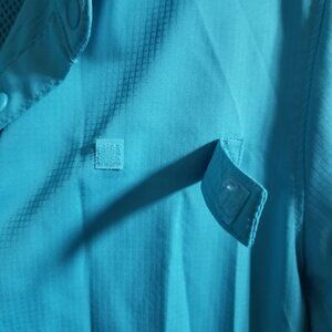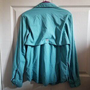 Columbia PFG Tamiami women's light blue/teal UV protection long sleeved shirt, size medium. Closes with snap buttons. Has a strap at the chest and a zippered pocket on the right side. Vented in the back. No flaws, like new, EUC.