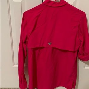 Women’s pink Columbia shirt. All buttons intact. Both sleeves roll up to quarter sleeve as shown in picture. Good condition only worn once