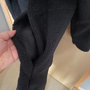Cozy black teddy jacket. Features a high collar and front pocket. Perfect for warmth and style.