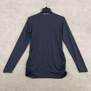 This Columbia Performance Shirt is designed for women in size Small with a blue striped pattern. It features long sleeves with thumb holes, a crew neck, and a casual sleeve style. Made from a polyester blend jersey fabric, this lightweight shirt is perfect for outdoor activities and casual wear. The shirt also includes Omni Wick technology to keep you dry and comfortable, making it a versatile option for fall weather.
