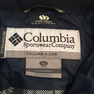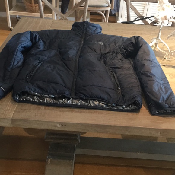 Spots inside of jacket are part of material made from Omni-heat, 100% tactile nylon, 100% polyester, very lightweight jacket, 51” chest, sleeves 24 1/2” , 28” length, zipper front, high neck,