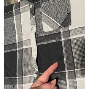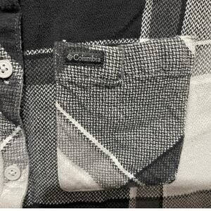 Check out this Columbia plaid flannel shirt, ideal for comfy layering. It features a stylish gray, black, and white plaid pattern with a button-down chest pocket. It's in excellent preowned condition, with just a small stain on the front. Make sure to have a look at all the photos!
