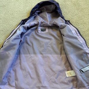 Columbia jacket in a soft lavender hue. Includes a hood and smooth lining.