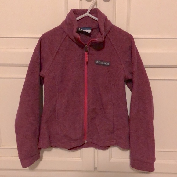 Columbia Raspberry Sweater Fleece Zip Front Jacket. Classic style fleece jacket. In a ‘raspberry’ heather with bright pink detail. Full front zipper. Side zipper pockets. Machine wash. Great pre owned condition with moderate pilling from being washed. No stains or holes. Pet and smoke free home.
