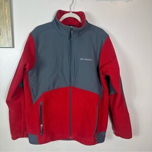 Stylish Columbia jacket. Features red and gray color scheme. Full zip front. Two zippered pockets.