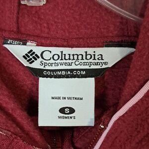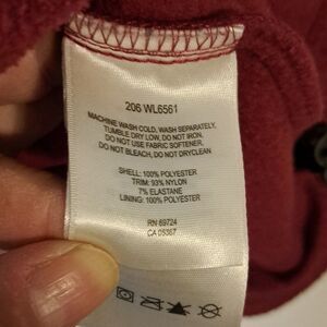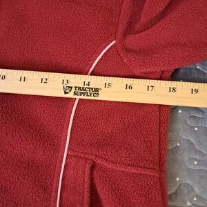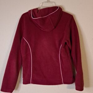 Cozy red fleece jacket with a hood. Features a full zip closure.