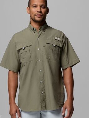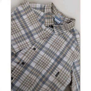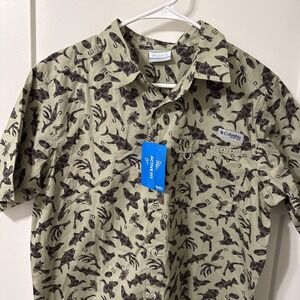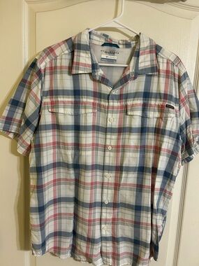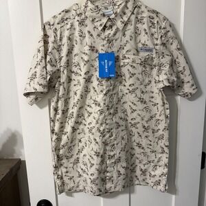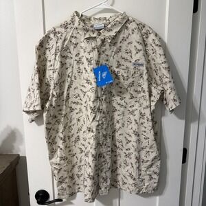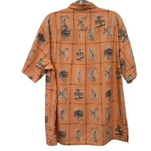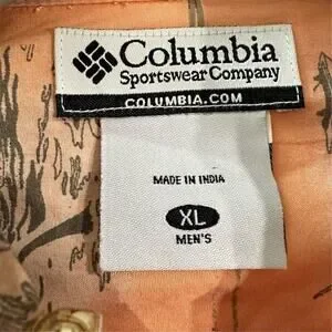 Keywords: Columbia, men's shirt, button-up, XL, orange, graphic print, casual, short sleeve, collared, cotton, fishing, outdoor, summer, spring, machine washable.