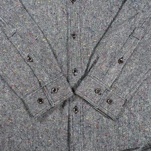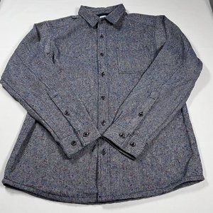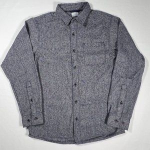 Columbia button down. Heavyweight Polyester/wool blend shirt. Base color is a grey blue with speckled colors throughout. Like new condition, no flaws.