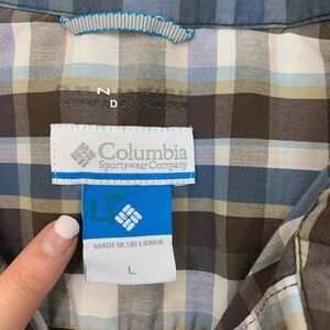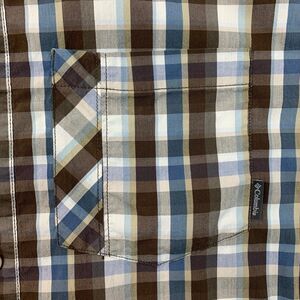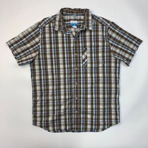 Columbia Shirt Mens L Large Brown Blue Decoy Rock Omni Wick Plaid Short Sleeve