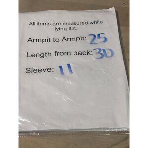 Approximate flat measurements: Armpit to armpit: 25", Length from back: 30", Sleeve: 11"
