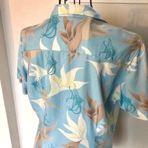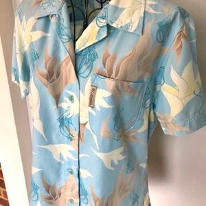 Light blue shirt with blue, yellow, and brown Angel fish and seaweed motif from Columbia Sportswear Company. One front left breast slide pocket. Side Hemline split. Size S. Approximate measurements:
