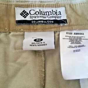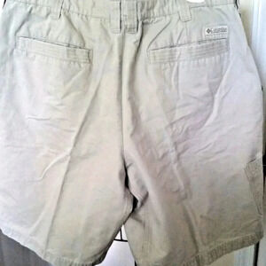 This is a great pair of men's Columbia cargo shorts. Size 40, Khaki, flat front, 100% cotton. Excellent pre-owned condition with no stains, rips, tears, or flaws.