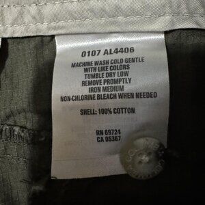 Features: Ripstop fabric; front vertical zip pockets; front button-flap cargo pockets; rear patch pockets; belt loops; button at waist