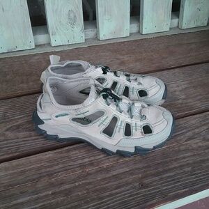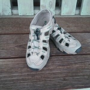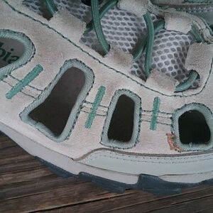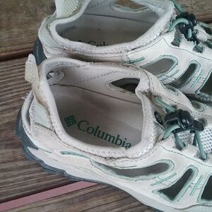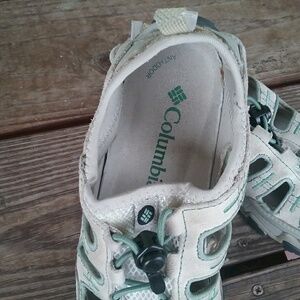These shoes are pre owned and show some wear. There's a very small spot where the shoe glue has darkened but over all these shoes are in great condition. See pics.